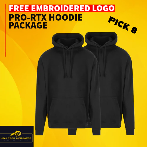 Introducing High Peak Workwears 8x Embroidered Pro RTX Hoodie Pack. Comfortable and classic, the Pro RTX hoodie is an essential addition to your workwear offering. Cut in a modern and comfortable fit, with twin-needle stitching for extra durability, the slip on style has a drawcord hood and front kangaroo pocket.